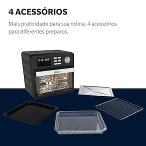 Acessórios: Bandeja coletora de migalhas, assadeira e coletora de gordura, cesto de fritura e grelha e prateleira.