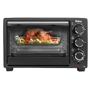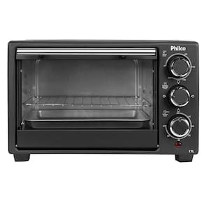 Forno Elétrico Philco PFE17P com capacidade de 17 litros, 4 modos de seleção de resistência, timer de 60 minutos, interior galvanizado e seletor de temperatura até 230 graus.Forno autolimpante