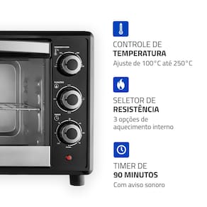 Timer de 90 Minutos: Programe o tempo de cada alimento com a segurança do desligamento automático com aviso sonoro. Mais comodidade para você fazer outras tarefas enquanto o forno trabalha.