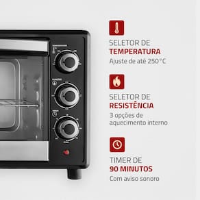 Forno elétrico Mondial Family II FR-42 com capacidade de 42 litros, potência de 1600W, timer de 90 minutos, controle de temperatura ajustável (100°C a 250°C), seletor de resistência e grelha com regulagem de altura.Forno autolimpante