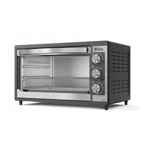 Forno elétrico Philco PFE52P 50L com timer de 60 minutos, seletor de temperatura de 100°C a 230°C, função dourar e grelha de inox com 3 regulagens de altura.Forno autolimpante