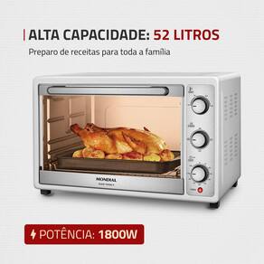 O forno elétrico Grand Family II FR-52-W da Mondial tem muito espaço para você caprichar nas receitas da sua família. Com capacidade para 52 litros, ele é multifuncional: aquece, cozinha, tosta, assa, gratina e grelha os alimentos. Possui controle de temperatura, grelha com regulagem de altura, timer de 90 minutos com desligamento automático e alta potência de 1800W. Saiba mais sobre o FR-52-W da Mondial: