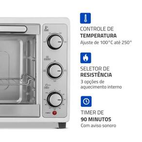 Com 1.800W de potência, o forno aquece rapidamente e garante o preparo uniforme de diferentes tipos de alimentos. Ele conta com controle de temperatura ajustável de 100C a 250C, permitindo escolher a intensidade ideal para cada receita. Além disso, o timer de 90 minutos com desligamento automático e aviso sonoro oferece mais praticidade e segurança, permitindo que você realize outras tarefas enquanto o forno faz o trabalho.