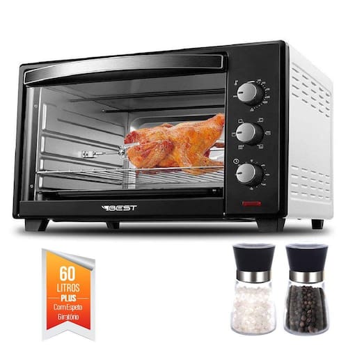 Forno Eletrico Best 60 Litros Plus Preto/Branco com Espeto Giratório acompanhado de Kit Moedor de Sal e Pimenta Bela Home