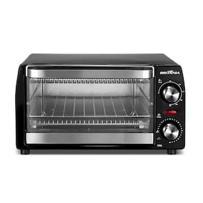 Forno elétrico Britânia com capacidade de 10 litros, 2 resistências (superior e inferior), temperatura ajustável até 230°, timer de 60 minutos com desligamento automático, grelha deslizante e porta em vidro temperado.Forno autolimpante