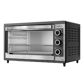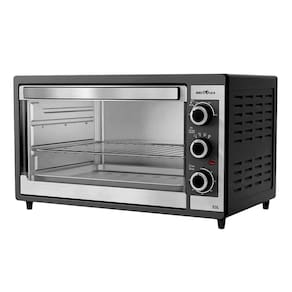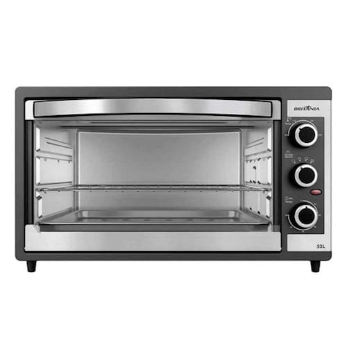 Forno elétrico Britânia BFE55P com capacidade de 52L, seletor de temperatura de 100°C a 230°C, timer de 60 minutos com aviso sonoro, grelha em inox ajustável e bandeja coletora de resíduos.Bandeja para resíduos