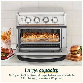 Capacidade Ampla: Perfeito para refeições de todos os tamanhos! Este forno acomoda até 6 fatias de pão, frita ao ar 1,4 kg de asas de frango, assa uma pizza de 30 cm ou prepara um frango inteiro de até 1,8 kg.