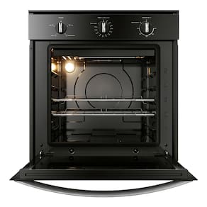 Forno elétrico de embutir com design moderno em preto, acabamentos metálicos e revestimento esmaltado que facilita a limpeza. Possui alta capacidade de 84 litros, 2 prateleiras com 5 níveis de altura ajustáveis, timer com desligamento automático e grill elétrico.Timer