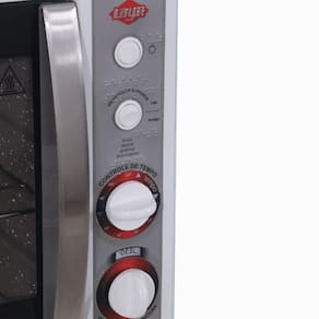 Forno Elétrico Layr Crystal Plus Advanced com termostato de 50-300°C, timer de 0 a 120 minutos, porta removível de vidro temperado, isolamento térmico em lã de rocha e revestimento autolimpante. Possui resistências blindadas (1 superior de 750W e 1 inferior de 1000W) e visor iluminado de temperatura.Timer