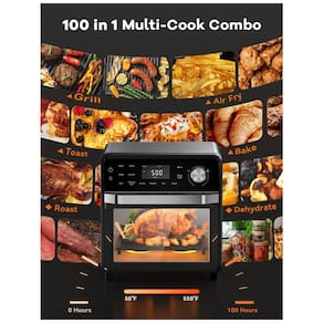 Combinação de Cozimento Air Fryer e Forno Grill: O forno inteligente possui uma grelha inferior e um aquecedor superior com ventilador, ajustável de 10°C a 232°C em incrementos precisos de 2,5°C para um cozimento personalizado em duas zonas, com duração de até 99 horas.