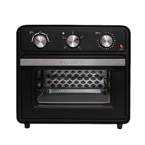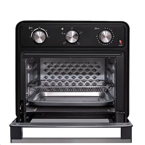 Forno elétrico de bancada com função air fryer, termostato ajustável até 250°C, timer de 60 minutos com desligamento automático, grill, uma prateleira com três níveis de altura e pés antiderrapantes.Forno autolimpante