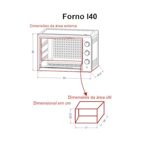 Características Capacidade 40 Litros Timer de 60 minutos Termostato até 250°C Bandeja para resíduos Grade Interna Luz piloto Indica se o forno está ligado Grill e Dourador Interior Antiaderente