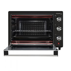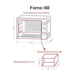 Forno de bancada com capacidade de 50 litros. Possui timer de 120 minutos, termostato até 250°C, bandeja para resíduos, grade interna, luz piloto, grill e dourador. Interior antiaderente.Forno autolimpante