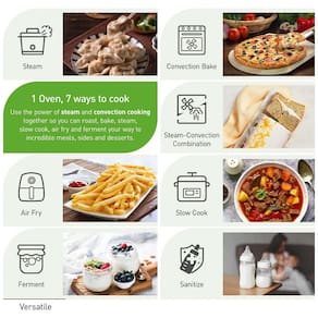 7 Funções em 1: Oferece modos de Convecção, Vapor, Assado com Vapor e Convecção, Airfry, Cozimento Lento, Fermentação e Sanitização, ideal para preparar desde pratos leves e crocantes até receitas fermentadas como iogurte, além de esterilizar utensílios e mamadeiras.