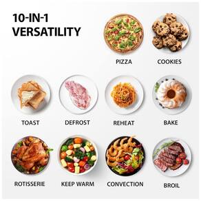 Este forno multifuncional atende a todas as suas necessidades culinárias com 10 modos de preparo: tostar, assar, grelhar, pizza, cookies, descongelar, reaquecer, rotisserie, manter aquecido e convecção. Um aparelho completo para facilitar sua rotina na cozinha.