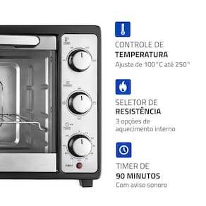 Funcoes do Eletrodomestico: Aquece, cozinha, tosta, grelha, ajuste de temperatura, timer de 90 minutos, aviso sonoro, Regulagem de altura de grelha.