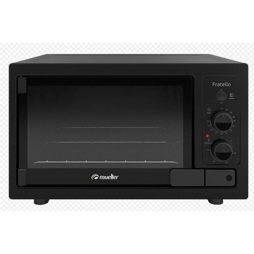 Forno elétrico de bancada Mueller Fratello Grill com capacidade de 44 litros, timer de 120 minutos, grill, prateleira com três opções de altura e bandeja coletora de resíduos.Forno autolimpante