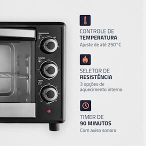 TIMER DE 90 MINUTOS: Mais liberdade e segurança para você fazer outras tarefas enquanto o forno trabalha. Com aviso sonoro, o aparelho desliga automaticamente ao término do preparo.