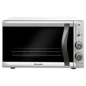 Características gerais: Marca: Mueller Modelo: MFB50F Tipo: Forno elétrico Capacidade: 50 litros Instalação: Bancada Timer: Sim Grades: Ajustável Grill: Sim Display: Não Funções: Assa, doura e aquece Bandeja para resíduos: Sim Iluminação: Sim Pés: Sim Potência: 1800W Origem: Nacional