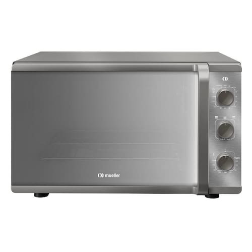 Forno elétrico de bancada Mueller com capacidade de 50 litros, 3 modos de assar, grill, timer sonoro com autodesligamento, luz interna, interior total clean, isolamento térmico eficiente e porta com vidro duplo.Forno autolimpante