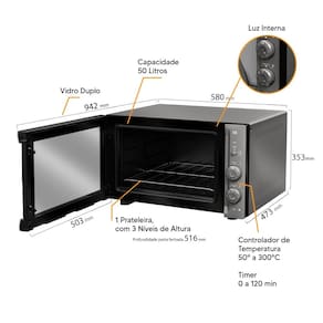Características Gerais do produto Forno elétrico de bancada cometros 50 litros de capacidade, sistemetrosa de aquecimetrosento superior e inferior cometros grill, vidro duplo na porta, controle de temetrosperatura de até 300°C, timetroser de 120 metrosinutos cometros aviso sonoro, luz interior, acabametrosento interno Total Clean, resistências blindadas, isolametrosento térmetrosico total e janela de exaustão.
