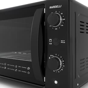 Forno de bancada com prateleira fixa, luz interna, revestimento 'limpa fácil', controle de temperatura de 50°C a 300°C, função grill, timer de até 120 minutos, porta de vidro panorâmico, isolamento térmico.Forno autolimpante