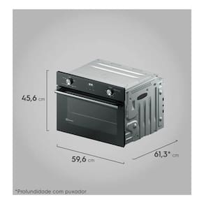 Este forno eletrico de embutir e ideal para quem busca eficiencia e estilo na cozinha. Com capacidade de 50 litros e potencia maxima de 2049 W, ele opera em uma tensao de 220V, garantindo um cozimento rapido e uniforme. Seu design moderno na cor preta e material em metal se integra perfeitamente a diferentes estilos de decoracao. As dimensoes sao 45,6 cm de altura, 59,6 cm de largura e 61,3 cm de profundidade, com um peso de 19,80 Kg. O forno possui luz interna, facilitando a visualizacao sem abrir a porta, e inclui grill, ideal para grelhar carnes e vegetais. Conta tambem com timer, que ajuda a controlar o tempo de cozimento sem preocupacoes. Acompanha uma grade e oferece garantia comercial de 12 meses, assegurando tranquilidade na compra e uso do produto. Ean: 7909569380031