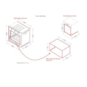 Forno de embutir com 60 litros de capacidade, timer de 120 minutos, controle de temperatura até 300°C, dourador, interior em Easy Clean, botões retráteis, moldura com ventilação.Timer
