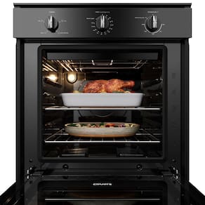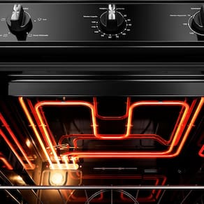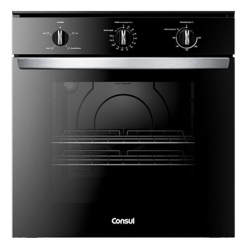 Forno de embutir com design moderno em preto, 84L de capacidade, timer com desligamento automático, grill elétrico, 2 prateleiras com 5 alturas ajustáveis e revestimento esmaltado para fácil limpeza.Timer