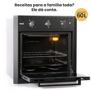 Forno Elétrico de Embutir Moob by Nardelli E60 com Luz Interna e Função Grill 60 Litros Preto 220V Se a sua cozinha planejada pede um toque de sofisticação e praticidade, o forno de embutir E60 Moob by Nardelli é a escolha ideal. Com design moderno e elegante, ele une funcionalidade e estilo, deixando seus preparos mais fáceis e sua cozinha mais completa. Com 60 litros de capacidade, você pode assar desde pratos do dia a dia até receitas mais elaboradas, com espaço para maior quantidade de alimentos. A porta de vidro permite acompanhar o preparo com segurança, enquanto a função Grill/Dourador garante aquele acabamento dourado e crocante irresistível. O controle automático de temperatura, que vai de 0 °C a 300 °C, aliado ao timer de até 120 minutos, oferece praticidade para diferentes tipos de receitas. Já o interior com acabamento Easy Clean esmaltado facilita a limpeza após o uso, tornando sua rotina muito mais leve.