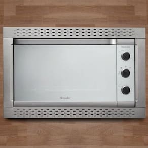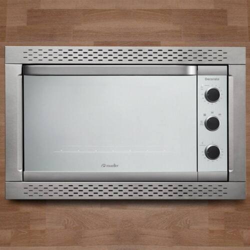 Forno elétrico de embutir Mueller Decorato Inox com capacidade de 44L, grill, timer dupla função, duplo estágio na porta, interior autolimpante, controle independente das resistências e sistema de embutir facilitado.Timer