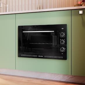 simForno Elétrico de Embutir Mueller 50?L?MFE50K: forno compacto e eficiente de 50 litros, acabamento em vidro preto elegante, 7 funções de cocção, temperatura ajustável até 300 C, interior esmaltado Total Clean para fácil limpeza, porta com vidro duplo e timer digital com autodesligamento ideal para deixar sua cozinha moderna e funcional.