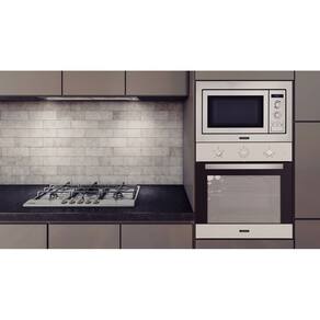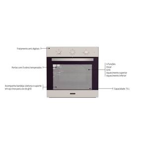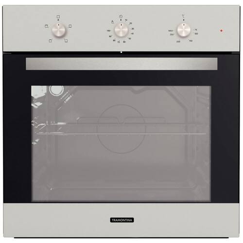 Marca: Tramontina Modelo.: 94864320 Voltagem: 220V Potência: 2100 W Uso exclusivamente doméstico Instalação: Embutir Funcionamento: Elétrico Capacidade (Volume líquido): 71 litros Material: Aço Inox Acabamento anti-digitais: Sim Comando: Mecânico Bloqueio do painel: Não Indicador de calor residual: Não Ventilador interno: Não Sistema de resfriamento: Sim Temperatura máxima interna: 270 ºC Prateleira telescópica: Não Posição para grelhas e bandejas: 5 Níveis Timer com desligamento automático: Sim Iluminação: 1 Lâmpada interna 25 W Vidros na porta: 3 Puxador: Aço inox Frequência: 60 Hz Funções: 4 - Assar - Grill - Aquecimento Superior - Aquecimento Inferior Acessórios Inclusos: - Bandeja Coletora funda - Grelha - Kit para instalação Produto certificado cfe. OCP-0029, UL, Segurança, Compulsório, Inmetro.