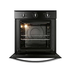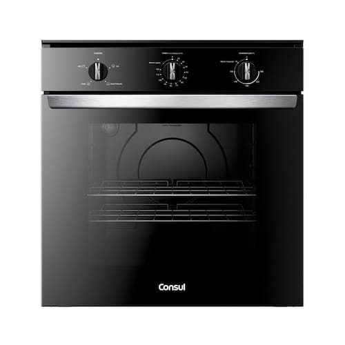 Forno elétrico de embutir com design moderno em preto, acabamentos metálicos e revestimento esmaltado que facilita a limpeza. Possui alta capacidade de 84 litros, 2 prateleiras com 5 níveis de altura ajustáveis, timer com desligamento automático e grill elétrico.Timer