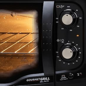 O forno elétrico de bancada Fischer Gourmet Grill, controle automático de temperatura de 50C a 320C e Dourador: receitas com melhor aspecto. Timer de até 120 minutos com aviso sonoro. Assa, doura, tosta, gratina e aquece. Também possui Luz piloto (indica quando o forno está ligado e quais funções estão sendo utilizadas), Lâmpada interna que facilita a visualização dos assados, com proteção de vidro. Pés antiderrapantes que oferecem mais estabilidade e segurança no uso do produto. Além disso, o vidro duplo tem a função de manter por mais tempo o calor interno, conservando a temperatura dos assados e reduzindo o consumo de energia elétrica.