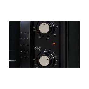 Forno elétrico de bancada com controle de temperatura automático de 50ºC a 320ºC, timer de até 120 minutos com aviso sonoro, dourador, lâmpada interna com proteção, luz piloto, controle independente das resistências, porta com abertura lateral, frontal em termoplástico, grade cromada removível (2 alturas), bandeja esmaltada para resíduos, corpo interno autolimpante, corpo externo pintado preto, porta com vidro duplo serigrafado, isolamento térmico e pés antiderrapantes.Forno autolimpante