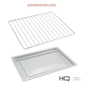 Forno elétrico de bancada com controle de temperatura ajustável até 250°C, temporizador de 120 minutos, botão ON em aço inoxidável fosco, porta com vidro de 0,4 mm e material de fabricação em aço inoxidável.Forno autolimpante