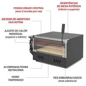 Este forno é a revolução dos fornos industriais, sem fumaça, sem sujeira e com um sabor ainda melhor. Com acendimento automático, neste forno você apenas precisa apertar um botão e pronto, o fogo já está acesso. Achou pouco? O forno elétrico guilhotina assa o seu alimento ainda mais rápido do que o normal, é mais fácil de limpar e deixa ainda mais saboroso e suculento os alimentos. Este forno é um dos únicos do mercado com resistência de mega potência, além de serem mais potentes também são muito mais econômicos. Eles consomem apenas 0,24kw/H, quase a metade do que convencionais.
