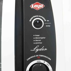 Forno elétrico com revestimento interno easy-clean, termostato ajustável de 50°C a 300°C, duas resistências blindadas (superior 750W e inferior 1000W), tecla multifunção, isolamento térmico, porta de vidro cristal temperado com perfil de alumínio anodizado e pintura eletrostática, uma prateleira removível com três posições de ajuste.Forno autolimpante