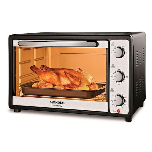 Forno Elétrico Mondial Grand Family II FR-18 com capacidade de 48L, timer de 90 minutos, temperatura até 250°C, 1800W de potência, resistências superior e inferior independentes, e grelha com regulagem de altura.Forno autolimpante
