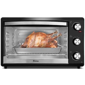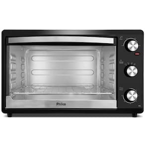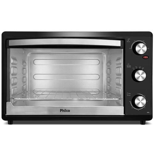 Forno Elétrico Philco PFE44P com capacidade de 44 litros, dupla resistência, temperatura ajustável de 100°C a 250°C, função dourar, timer de até 60 minutos com desligamento automático, grelha de aço inox ajustável em 3 níveis e bandeja coletora de resíduos.Forno autolimpante