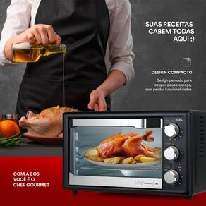 O Forno Elétrico Eos Cheff Gourmet chegou para ajudar você a tornar sua vida muito mais prática e segura. Prático de utilizar, o forno Eos não precisa de instalação, apenas o ligue na tomada e ele já está pronto para deixar suas receitas mais gostosas. Para garantir sua segurança, o forno EOS não precisa de gás, sendo totalmente elétrico, eliminando o risco de vazamentos ou explosões de gás. Seu timer de 60 minutos e controle de temperatura de até 230C permite mais versatilidade ao preparar suas deliciosas receitas, além de poder controlar qual das duas resistências será utilizada, sendo apenas a superior, a inferior ou ambas - para a perfeita distribuição da temperatura internamente. Principais Características: Prático - Não precisa de instalação, apenas ligar na tomada; Baixo Consumo de energia; Função Grill - Você pode dourar e gratinar seus pratos de forma prática; Alta capacidade interna - 36L de volume; Mais Controle - Você pode ligar apenas a resistência superior, inferior ou ambas; Seletor de temperatura até 230C; Timer de até 60 min; Antiaderente - muito mais facilidade para limpeza interna.