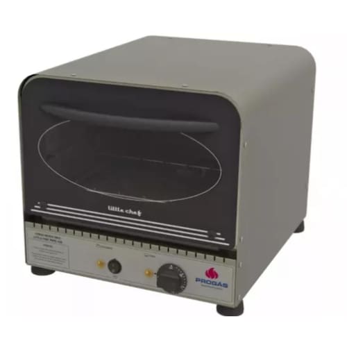 Forno Elétrico Progás Little Chef Inox, ideal para uso doméstico ou comercial leve. Design compacto, porta de vidro temperado, controle de temperatura ajustável e isolamento térmico eficiente.Bandeja para resíduos