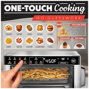 O painel digital com controle por toque oferece 12 funções pré-programadas: Air Fry, Bake, Roast, Toast, Bagel, Fries, Wings, Snacks, Broil, Dehydrate, Popcorn e Keep Warm, automatizando tempo e temperatura de acordo com a aplicação selecionada. O modo de convecção pode ser ativado para favorecer distribuição mais homogênea de calor, reduzindo o tempo de cocção e melhorando a uniformidade de resultados. As temperaturas podem ser configuradas até cerca de 204 °C, atendendo desde desidratação de alimentos a assados em alta temperatura.