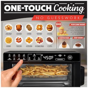 O painel digital com controle por toque oferece 12 funções pré-programadas: Air Fry, Bake, Roast, Toast, Bagel, Fries, Wings, Snacks, Broil, Dehydrate, Popcorn e Keep Warm, automatizando tempo e temperatura de acordo com a aplicação selecionada. O modo de convecção pode ser ativado para favorecer distribuição mais homogênea de calor, reduzindo o tempo de cocção e melhorando a uniformidade de resultados. As temperaturas podem ser configuradas até cerca de 204 °C, atendendo desde desidratação de alimentos a assados em alta temperatura.
