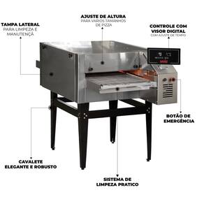 O Forno Esteira Elétrico para Pizza Hidro 50cm Trifásico 220V FEI5022 é a solução ideal para pizzarias, restaurantes e cozinhas profissionais que buscam mais agilidade e qualidade no preparo. Com esteira de 53 cm de largura e 170 cm de comprimento, ele permite assar pizzas de até 50 cm de diâmetro com precisão e uniformidade. Seu sistema de controle digital com visor permite ajustes de tempo por temporizador e velocidade da esteira, oferecendo cinco espaços de memória para tempos preprogramados. Por ser um forno elétrico que não emite fumaça, é ideal para ambientes com pouca ventilação ou sem exaustão. Fabricado 100% em aço inox 304, garante durabilidade, fácil higienização e excelente acabamento para sua cozinha profissional.