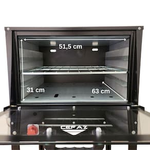 Forno Profissional Grande com Cavalete Baixa Pressão Tampa de Vidro Marca Cefaz O Forno Profissional Cefaz 100 Litros conta com sistema de gás GLP Baixa Pressão e queimador em serpentina tubular 7/8”, as laterais do forno externo em aço carbono com pintura epóxi na cor preta, sua Tampa de Vidro temperado com puxadores em baquelite, e seu acabamento interno em chapa minimizada Para melhor aquecimento seu isolamento é produzido com lã de rocha aplicado nas laterais, chegando até 250°, assim aumentamos mais sua caloria interna e reduzimos a caloria externa! Contém sistema de botão regulador de gás para o controle da chama. Acompanha 1 Grelha contendo 3 níveis de altura. Ideal para Bolos, massas, pães, carnes, peixes e outros vários tipos de alimentos. Informações Técnicas - Modelo: FRG-16 - Alimentação: Gás GLP Baixa Pressão - Temperatura máxima de até 250 graus - Cor: Preto - Capacidade 100 litros - Forno com visor de vidro temperado - Acabamento interno em chapa minimizada - Acabamento externo em aço carbono pintado - Isolamento em Lã de Rocha - Cavalete em aço carbono pintado - Acompanha 1 grelha - Consumo de gás 0,395kg/h Medida Interna do Forno Altura: 31cm Largura: 51,5cm Comprimento: 63cm Medida externa do forno montado com cavalete Altura: 135cm Largura: 63cm Comprimento: 70cm Peso 30,7kgGarantia 3 Meses contra defeito de fabricação