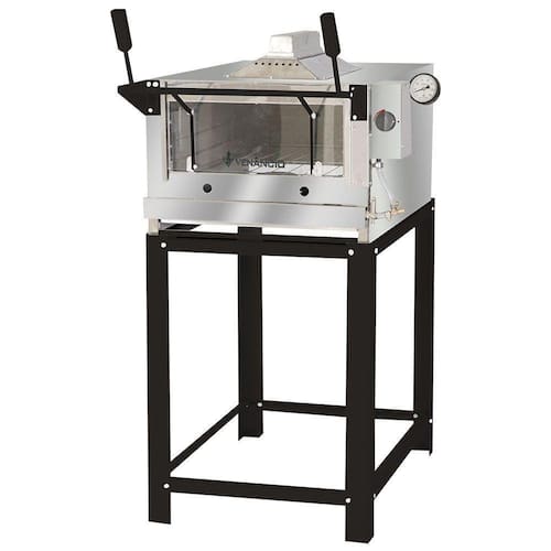 Esse Forno conta com estrutura em aço inox, super queimadores e sistema de abertura de portas do tipo guilhotina com acabamento em pintura a pós eletrostática com base fosfatizada. Seu revestimento interno é feito em aço galvanizado com lã de rocha que permite um aquecimento uniforme sem deixar o forno resfriar sendo indicado para uso industrial e profissional.