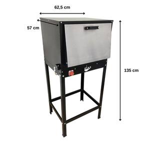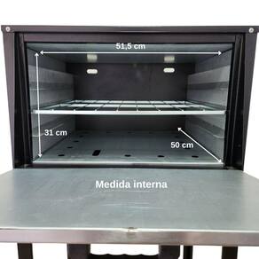 Forno Profissional Médio com Cavalete Alta Pressão Tampa Inox Marca Cefaz O Forno Profissional Cefaz 80 Litros conta com sistema de gás GLP Alta Pressão e queimador em serpentina tubular 7/8”, as laterais do forno externo em aço carbono com pintura epóxi na cor preta, sua Tampa Inox com puxadores em baquelite, e seu acabamento interno em chapa minimizada Para melhor aquecimento seu isolamento é produzido com lã de rocha aplicado nas laterais, e tampa chegando até 250°, assim aumentamos mais sua caloria interna e reduzimos a caloria externa! Contém sistema de botão regulador de gás para o controle da chama. Acompanha 1 Grelha contendo 3 níveis de altura. Ideal para Bolos, massas, pães, carnes, peixes e outros vários tipos de alimentos.Informações Técnicas - Modelo: FRG-09- Alimentação: Gás GLP Alta Pressão- Temperatura máxima de até 250 graus- Cor: Preto- Capacidade 80 litros- Forno com Tampa Inox - Acabamento interno em chapa minimizada- Acabamento externo em aço carbono pintado- Isolamento em Lã de Rocha- Cavalete em aço carbono pintado- Acompanha 1 grelha- Consumo de gás 0,380kg/hMedida Interna do Forno Altura: 31cmLargura: 51,5cmComprimento: 50cmMedida externa do forno montado com cavalete Altura: 135cmLargura: 63cmComprimento: 57cmPeso: 26,3kg Garantia 3 meses contra defeito de fabricação