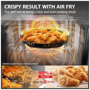 Forno micro-ondas 8 em 1 com funções de micro-ondas, air fryer, assar, grelhar, combi, baixa temperatura, remoção de odores e descongelamento. Potência de saída de micro-ondas de 1000 watts e potência de entrada de 1600 watts. Prateleira giratória removível de 31,5 cm. Pipoca com um toque, botões de fácil manuseio, prateleira giratória com memória de posição, cozimento rápido, cozimento em vários estágios, relógio, timer de cozinha e função muda. Design em aço inoxidável preto.Função Grill